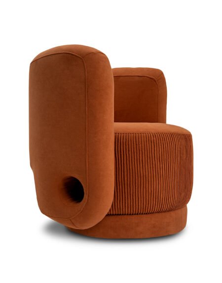 Com design orgânico e curvas inspiradas na coruja, a Poltrona CORU se destaca pelos detalhes laterais marcantes e costuras artesanais. Uma peça única, que transmite conforto visual e conexão com a natureza em cada traço.