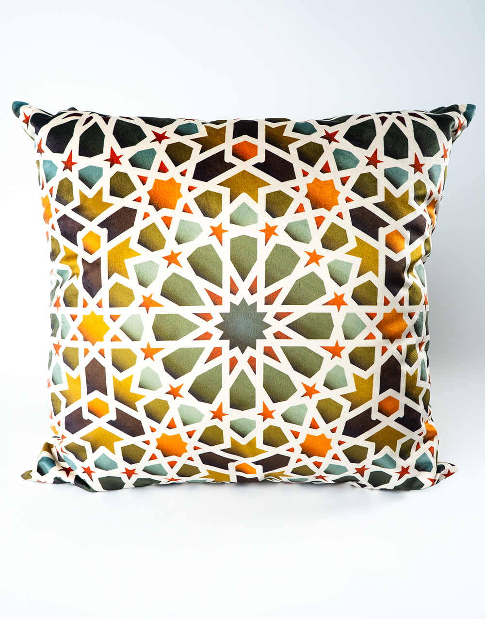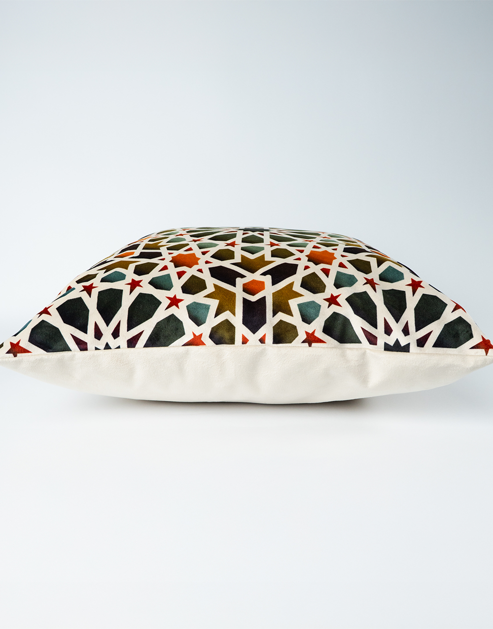 Ideal para quem busca sofisticação, impacto visual e autenticidade, a Kasbah transforma qualquer ambiente em um cenário de elegância e força estética. Seja sobre um sofá neutro ou compondo um mix de estampas, ela reflete a essência da Coleção Marrakesh: uma celebração de contrastes, culturas e histórias traduzidas em arte e conforto.