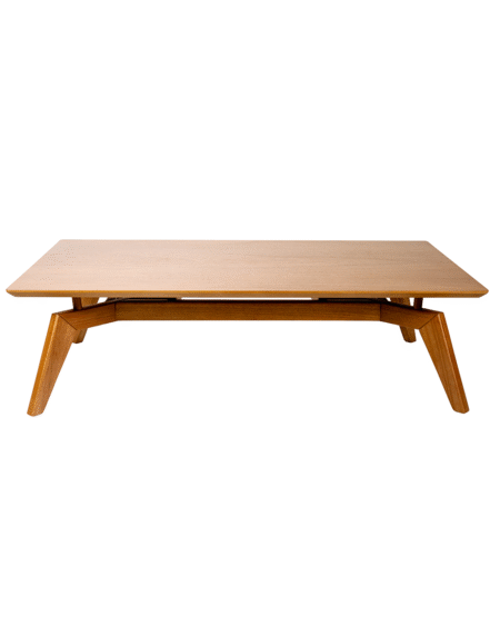 Seu tampo flutuante, sustentado por pinos torneados em madeira maciça, remete aos portais históricos de passagem, tão presentes na arquitetura japonesa e também em construções simbólicas da Europa clássica. A fluidez das formas e a precisão dos encaixes transmitem uma sensação de continuidade e estabilidade, essenciais ao estilo Japandi.
