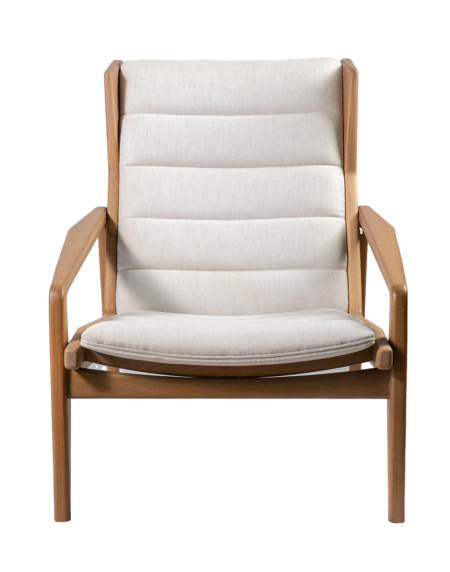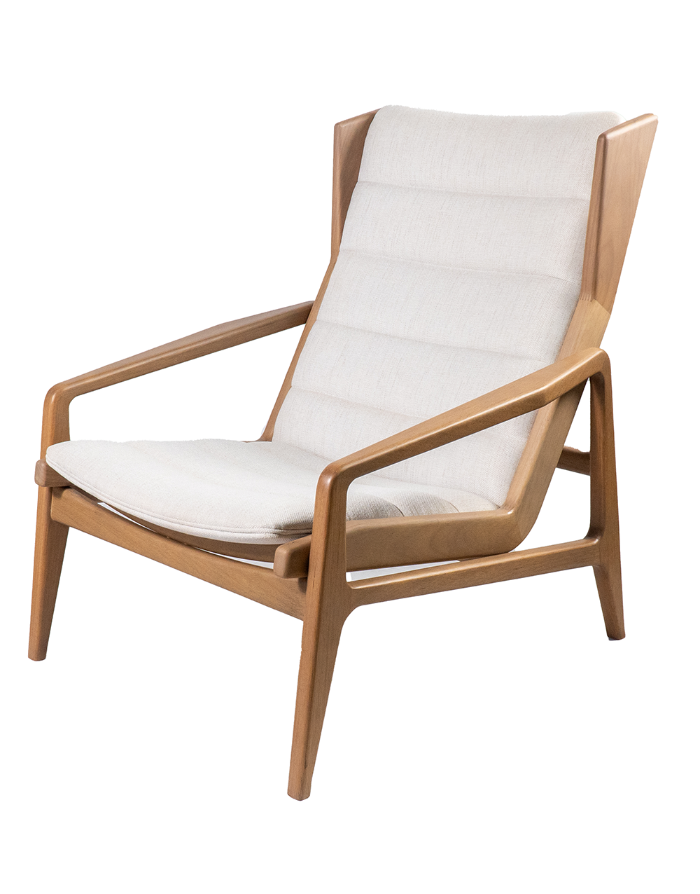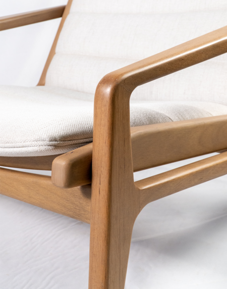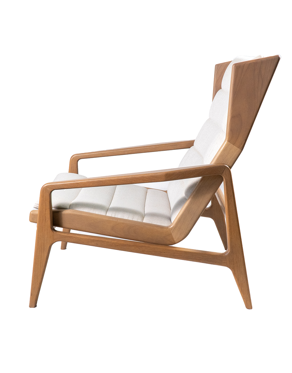 Sua estrutura é produzida em madeira maciça de jequitibá, uma espécie nobre que garante durabilidade, resistência e acabamento premium. O grande diferencial da peça está na decisão ousada e refinada de deixar a madeira aparente nos braços e nas abas laterais do encosto, substituindo o antigo revestimento total por linhas limpas e bem desenhadas que revelam toda a beleza do material natural.