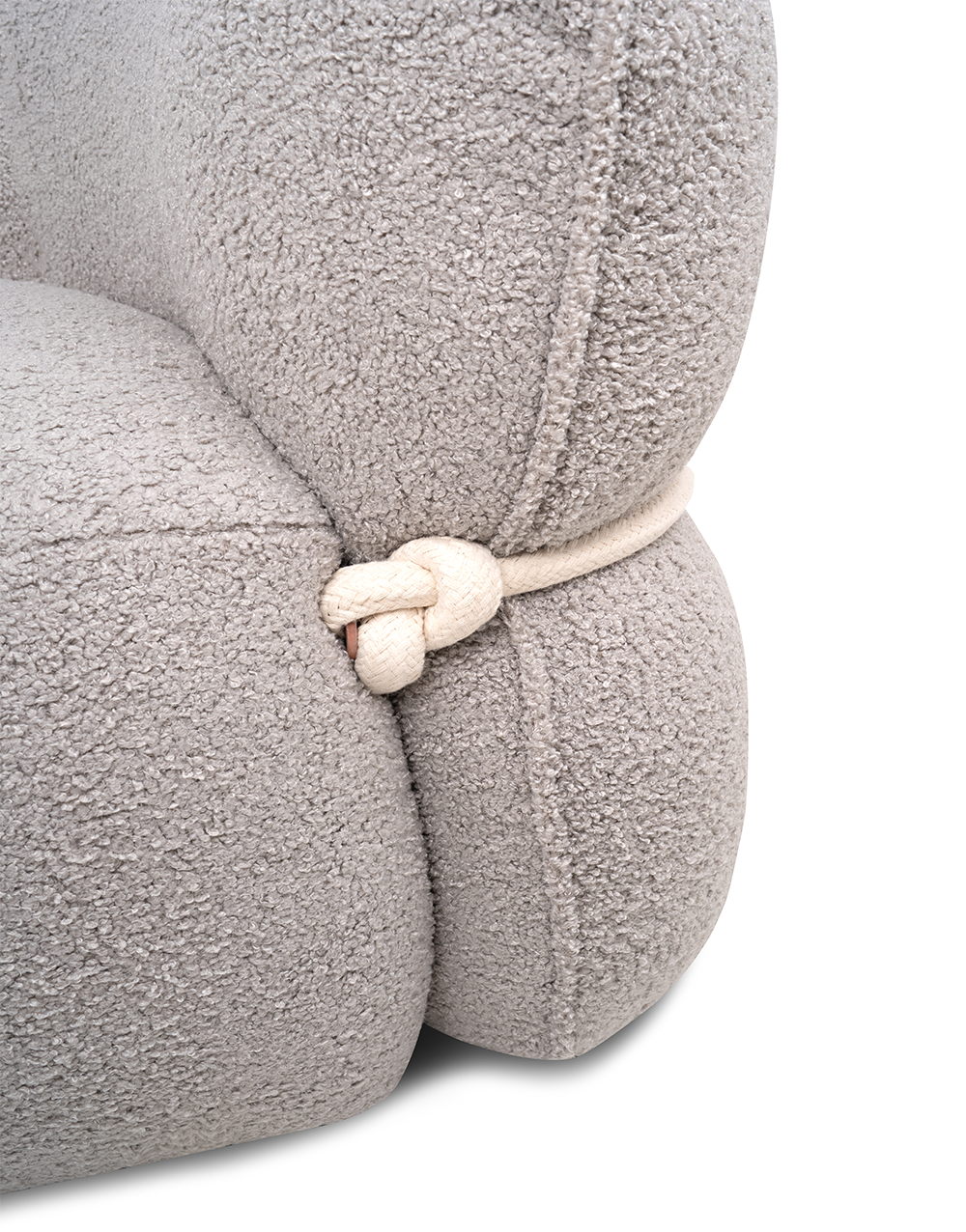 Sua estrutura firme é abraçada por um encosto curvo e orgânico, simbolizando a proteção, a intimidade e os laços emocionais que criamos com quem amamos. O contorno do encosto não é apenas estético — ele carrega a função emocional de envolver, amparar e acolher. Para intensificar essa percepção, o projeto inclui uma corda decorativa que atravessa o encosto em curva, como um gesto que fecha, aperta e une — criando uma clara referência visual aos laços afetivos.
